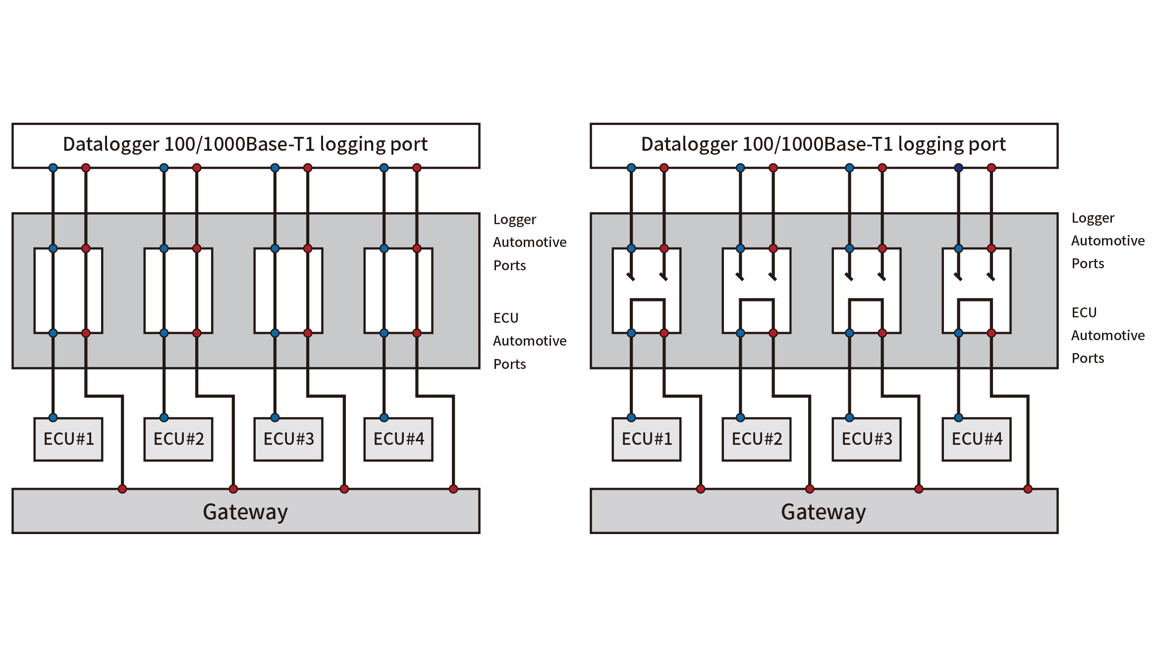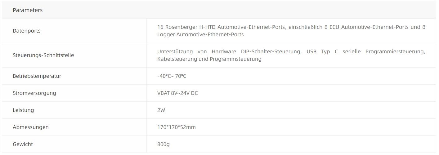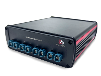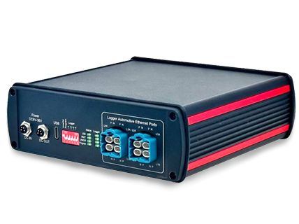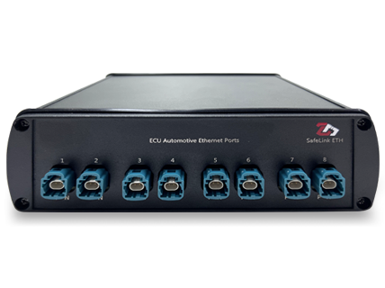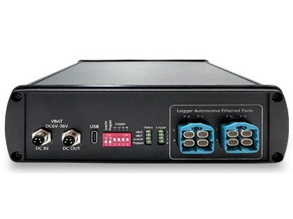 Wenn Anwender den Datenlogger mit Testgeräten verbinden müssen, können sie zuerst die Ethernet-Schnittstelle des Datenloggers auf die Steuergeräte-Schnittstelle des ZD SafeLink ETH schalten und dann die Ethernet-Ports des Prüfgeräts mit der Datenlogger-Schnittstelle des ZD SafeLink ETH verbinden. Der ZD SafeLink ETH unterstützt die gleichzeitige Verbindung von vier Kanälen des Automotive-Ethernet. Wenn das interne Relais angeschlossen ist, kann die Verbindung zwischen dem Datenlogger und dem Steuergerät aufrecht erhalten werden. Nun kann der Datenlogger als Bypass-Gerät die Kommunikationsdaten vom Steuergerät empfangen.