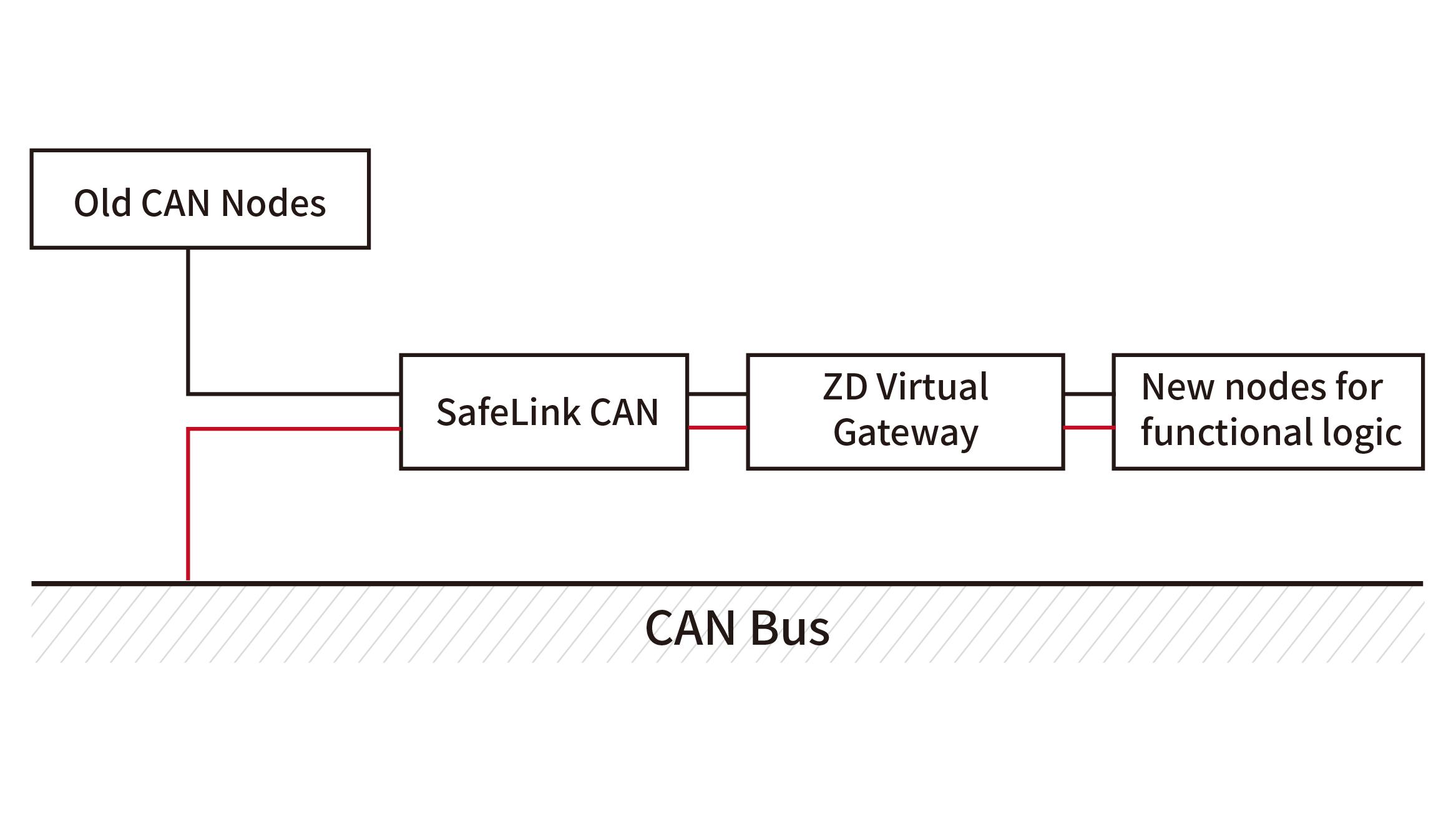 ZD SafeLink CAN kann in Verbindung mit dem Rapid-Prototyping-Gerät und dem ZD Virtual Gateway verwendet werden. Hiermit wird eine Funktionserweiterung auf Signalebene auf Basis des ursprünglichen Knotens, wie z.B. Eingriffe auf Signalebene, Weiterleitung und Anpassung der Kommunikation mehrerer CAN-Busse, erreicht.