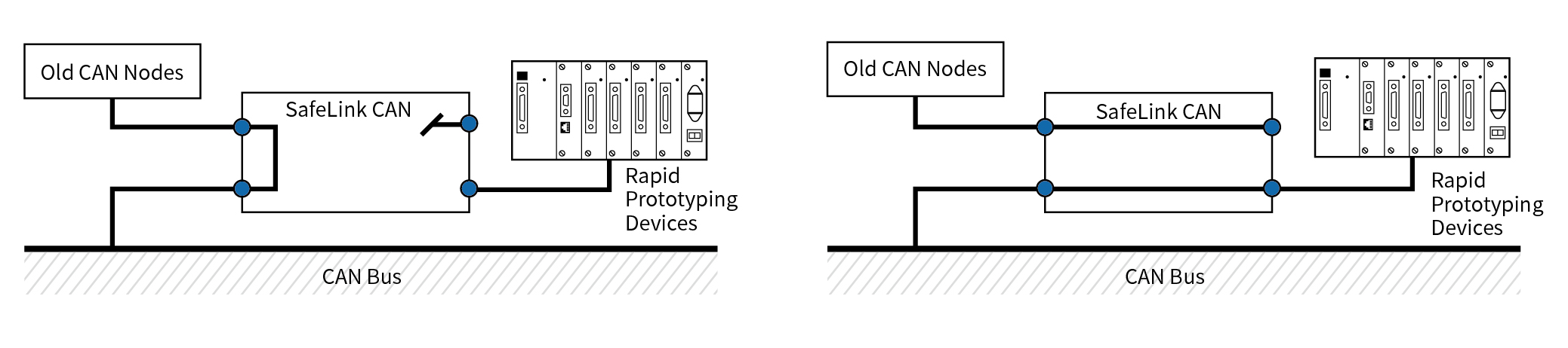 Da ZD SafeLink CAN die einzelnen CAN-Knoten physikalisch vom Bus trennt, kann der Anwender schnell zwischen verschiedenen CAN-Knoten umschalten und die CAN-Bus-Architektur einfach ändern. Wie in der Abbildung gezeigt, kann SafeLinkCAN den alten CAN-Knoten mit dem CAN-Bus verbinden, ohne dass ein Rapid-Prototyping-Gerät angeschlossen ist. Ebenso ist es möglich, den CAN-Knoten auf dem Rapid-Prototyping-Gerät umzuschalten und den alten CAN-Knoten vom Bus zu trennen.