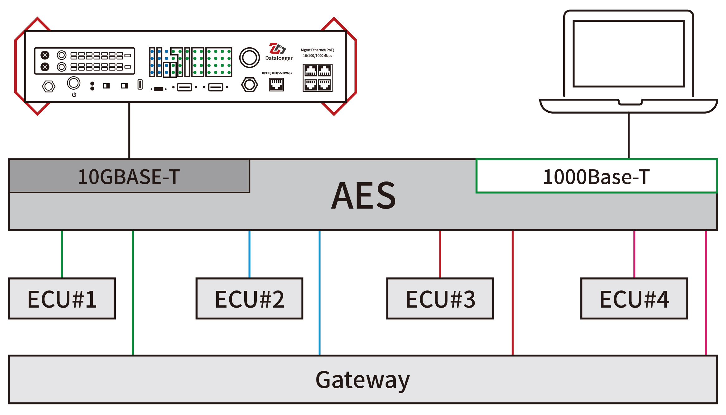 Bypass-Aufzeichnung von 4 Automotive-Ethernet-Kommunikationskanälen mit einem Datenlogger.